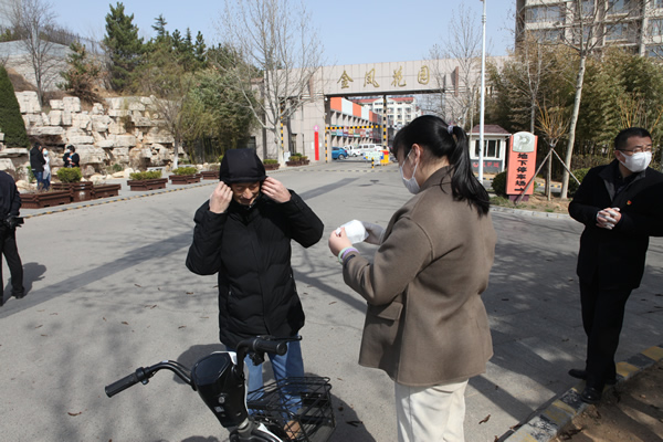 一到社區(qū),在社區(qū)的組織安排下,分成兩組分頭行動。第一組志愿者背起噴壺到居民小區(qū)消毒。第二組志愿者來到小區(qū)卡口,為工作人員及進(jìn)出居民發(fā)放口罩。遇到個別沒有佩戴口罩的行人,立馬進(jìn)行提醒,引導(dǎo)社區(qū)居民戴好口罩,做好自我防護(hù),不影響他人。