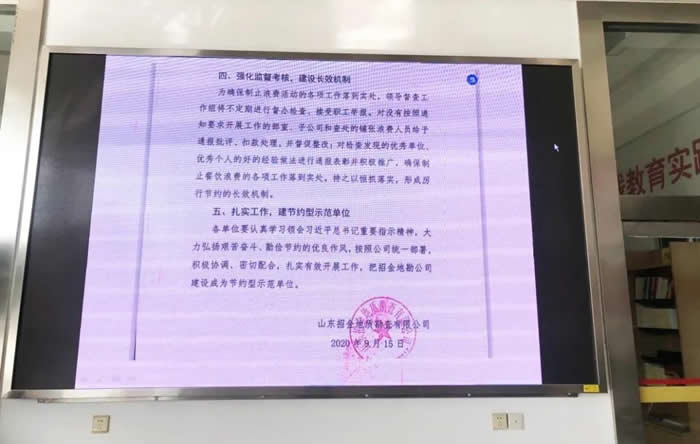 招金礦業(yè)股份有限公司蠶莊金礦下發(fā)《“厲行節(jié)約、反對(duì)浪費(fèi)”倡議書》,深入宣傳節(jié)約理念,倡導(dǎo)職工弘揚(yáng)“儉以養(yǎng)德、惜糧愛糧”的糧食文化。用餐時(shí)間,在食堂電子屏打出“厲行節(jié)約、反對(duì)浪費(fèi)”、“倡導(dǎo)文明就餐、杜絕浪費(fèi)”等標(biāo)語,時(shí)刻提醒和督促職工養(yǎng)成良好的節(jié)約習(xí)慣,重拾“節(jié)約”情懷,不忘過去艱苦歲月。