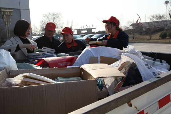 活動當天,許多職工拿著捆扎、整理好的廢舊書籍、報刊早早等候在現(xiàn)場?;顒又校皝砭栀洉母刹柯毠そj(luò)繹不絕,青年職工踴躍加入到志愿服務(wù)行列,協(xié)助清點、整理、搬運……不到一個小時,現(xiàn)場獲贈的廢舊書籍、報刊已經(jīng)裝滿一車。