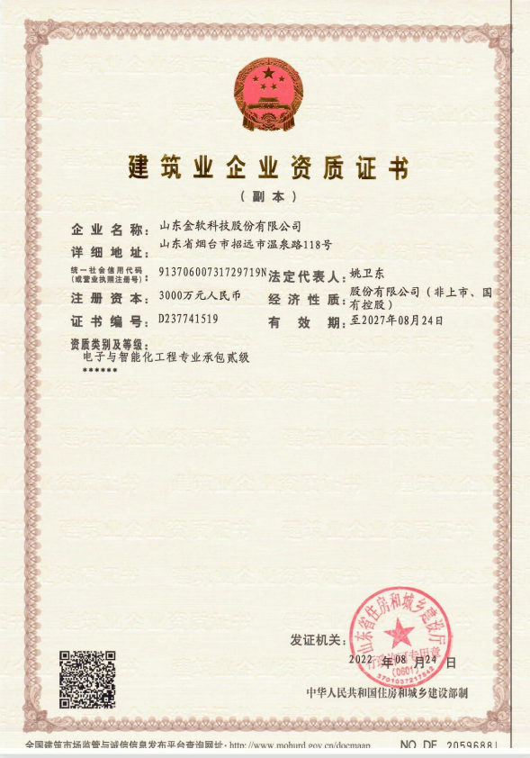 近日,經(jīng)山東省住房和城鄉(xiāng)建設(shè)廳批準,山東金軟科技股份有限公司順利取得“電子與智能化施工貳級資質(zhì)”,此