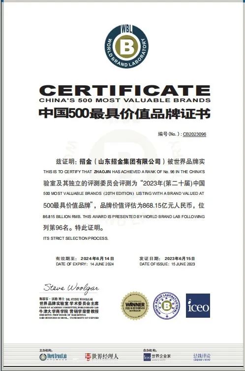 2023年中國500最具價值品牌榜單發(fā)布——招金集團(tuán)以868.15億元品牌價值位列第96位